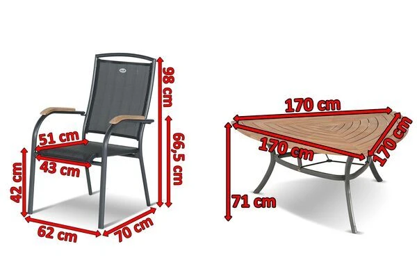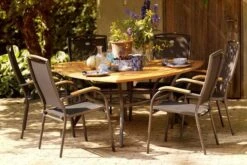 Wer seine Terrasse in neuem Licht erstrahlen lassen möchte, ist mit diesem Komplettset von Hartman bestens beraten. Es besteht aus 6 Stapelsesseln und einem dreieckigen Esstisch, mit einer hochwertigen FSC®-zertifizierten Teakholztischplatte. Durch seine besondere Form sitzen sich alle Gäste oder Familienmitglieder gleichmäßig gegenüber, sodass gemütlichen und geselligen Abenden nichts mehr im Wege steht.