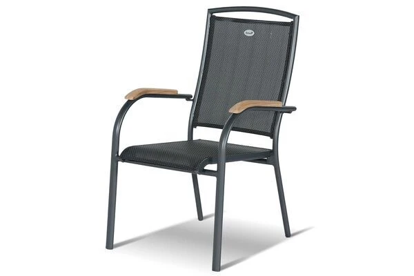 Die Stapelsessel überzeugen durch ihre schlichte Optik mit dem pulverbeschichteten Aluminiumrahmen in der Farbe Xerix, dem gleichfarbigen Textilen-Gewebe (70% Polyvinylchlorid, 30% Polyester) und den Armlehnen aus edlem FSC®-zertifiziertem Teakholz aus. Dank des Aluminiumgestells sind die Sessel mit einem Gewicht von ca. 4,2 kg zudem leicht und einfach zu transportieren. Aufgrund ihrer Bauweise können die Sessel einfach mit modellgleichen Stühlen gestapelt und platzsparend verstaut werden.