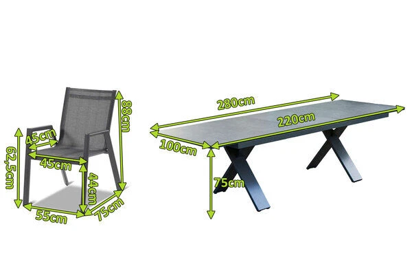 Der Tisch mit dem gekreuzten Gestell ist gefertigt aus pulverbeschichtetem Aluminium in der Farbe Xerix (Anthrazit) und wird optisch perfekt durch die Glaskeramik-Tischplatte, ebenfalls in der Farbe Xerix ergänzt. Die Maße von ca. 220 x 100 x 75 cm sorgen dafür, dass stets ausreichend Ablagefläche zur Verfügung steht. Bei Bedarf kann der Tisch auf eine Länge von ca. 280 cm ausgezogen werden, so finden bequem auch große Runden genügend Platz in Ihrem Garten. Dank der Ausziehfunktion hebt sich dieses Modell von den üblichen Tischen der Xanadu Serie ab – den Ausziehtisch erhalten Sie exklusiv bei uns.