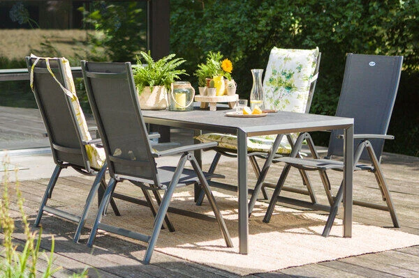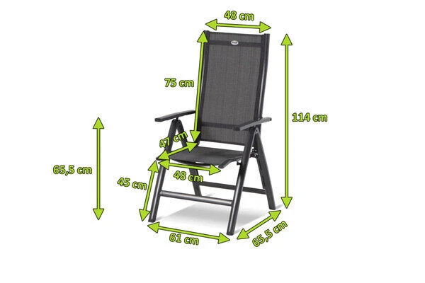 Die Sitzfläche von ca. 48 x 47 cm und die Sitzhöhe von ca. 45 cm sorgen hier zusätzlich für ein hohes Maß an Komfort. Das Gestell aus robustem Aluminium sorgt für ein geringes Eigengewicht von nur ca. 5,2 kg, sodass sich der Sessel kinderleicht verschieben oder an die gewünschte Position tragen lässt. So können Sie jederzeit flexibel entscheiden, ob Sie lieber in der Sonne oder im Schatten sitzen wollen. Trotz des leichten Gewichts ist der Multipositionssessel äußerst stabil und kann mit bis zu 135 kg belastet werden. Ob Sie beim Essen ganz aufrecht sitzen möchten oder sich in der Sonne zurücklehnen wollen, Sie finden dank der mehrfach verstellbaren Rückenlehne immer die richtige Sitzposition. Ebenso schnell und unkompliziert können Sie den Sessel zusammenklappen und platzsparend verstauen.