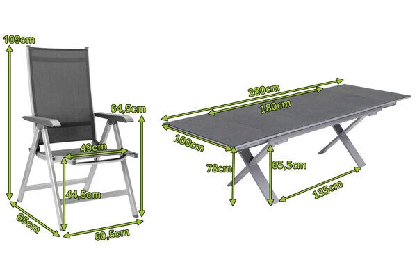 Das stylische Set besteht aus einem innovativen Ausziehtisch von OUTFLEXX® und 10 Multipositionssesseln der Serie BasicPlus von KETTLER. Der elegante Esstisch ist nicht nur optisch ein Schmuckstück, er unterstützt Sie auch bei der Bewirtung von Familie und Freunden. Sie können seine ca. 180 cm lange Tischplatte mithilfe des automatischen Schubladenauszuges ganz leicht um ca. 50 oder 100 cm auf maximal ca. 280 cm vergrößern. Ideal also für 6-10 Personen – und das nächste Gartenfest. Dazu ziehen Sie einfach an einer der beiden Verlängerungsplatten, die sich jeweils unter einem Tischende befindet. Jede Platte lässt sich so leichtgängig wie eine Schublade einzeln ausfahren und wird anschließend automatisch in der richtigen Höhe an die Tischplatte gedrückt. Fertig! Bei Bedarf ziehen Sie auch noch die andere Seite aus. Und wenn Ihre Tafel bereits gedeckt ist? Kein Problem, die Tischplatte lässt sich ebenso leicht gedeckt vergrößern und genauso mühelos auch wieder verkleinern. Sein Gewicht von ca. 59,25 kg verleiht dem ca. 180/280 x 100 x 78 cm großen Tisch zudem überragene Stabilität und Standhaftigkeit. Gönnen Sie sich diesen praktischen Luxus für Ihren Diningbereich, der sich auch visuell in Ihr Gartendesign integriert. Seine besondere Optik verdankt der Tisch der graufarbenen Tischplatte aus Sicherheitsglas mit Spraystone Finish, die perfekt mit dem modernen X-Gestell in Silber harmoniert. Das hochwertige Aluminiumgestell ist so hergestellt worden, dass Sie das Set auch mit allen KETTLER Artikeln in der Farbe “silber” ergänzen können.