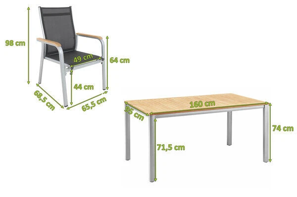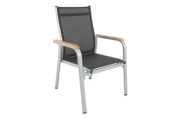 Mit den passenden Stapelsesseln aus der Granada Serie kommen Sie so bequem durch den Sommer. Das solide und formschöne Gestell besteht aus edlem, silberfarbenen Aluminium, wobei die Armlehnen aus FSC-zertifiziertem Teakholz für einen zusätzlichen Blickfang sorgen. Die anthrazitfarbene Sitzfläche wird aus wasserdurchlässigem, hochwertigem Kunststoffgewebe (70% PVC + 30% PES) gefertigt. Die Sitzfläche nimmt kein Wasser auf und trocknet schnell, so können Sie auch nach einem kleinen Regenschauer rasch wieder Platz nehmen. Das luftige Gewebe ist formstabil und trotzdem sehr bequem und zusätzlich UV- und sonnenölbeständig – insgesamt also der perfekte Begleiter in Ihrem Garten. Die nur ca. 5,5 kg schweren Sessel lassen sich aufstapeln – wenn sie nicht benötigt werden, können Sie sie platzsparend verstauen.