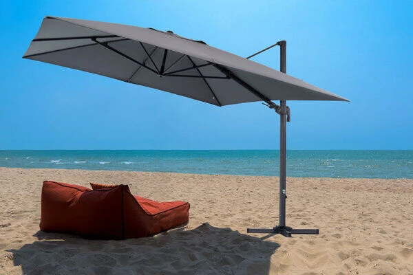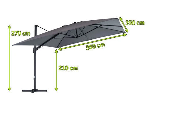 Der quadratische Sonnenschirm von OUTFLEXX® besticht durch seine hochwertig verarbeiteten Materialien und seine praktischen Funktionen. Das ca. 350 x 350 cm große Schirmtuch besteht aus 100% Polyester (ca. 250 g/m²). Zusätzlich ist das anthrazitfarbene Schirmtuch wasserabweisend imprägniert. Das Gestell besteht aus pulverbeschichtetem Aluminium in anthrazit und hat dabei eine Haupt-Rohrdicke von ca. 65 x 95 mm. Der Ampelschirm besitzt keinen Mittelmast und bietet daher eine praktische Lösung, um ohne Probleme eine komplette Sitzgruppe zu beschatten. Die großzügige Durchgangshöhe von ca. 210 cm schränkt die Nutzung Ihrer Terrasse in keinster Weise ein. Durch einen hohen UV-Schutz von 80+ spendet der Sonnenschirm dabei extra viel Schatten. Die Beschattung bei unterschiedlicher Sonneneinstrahlung ist mit diesem praktischen Ampelschirm problemlos möglich, da das Schirmtuch entlang des Standrohres und des Stützbalkens geneigt werden kann. Zudem lässt sich der Schirm durch den leichtgängigen Kurbelmechanismus kinderleicht aufspannen. Diese Kurbel können Sie in den unteren Teil des Schirmstocks umstecken und so den Schirm um 360° drehen. Das integrierte Air-Vent System lässt auch bei sehr warmen Klima die Luft unter dem Schirmtuch zirkulieren. Die 8 eingebauten Dachstreben mit den Maßen von ca. 17 x 25 mm sorgen zusätzlich für weitere Standfestigkeit. Im Lieferumfang ist ein Plattenständer für Wegplatten enthalten. Um einen sicheren Stand zu gewährleisten, empfehlen wir Ihnen den ca. 29 kg schweren Ampelschirm mit ca. 200 kg Wegplatten zu beschweren. Bitte beachten Sie, dass die Platten NICHT mit im Lieferumfang enthalten sind.