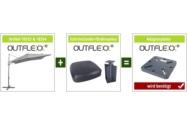 - Kombination mit OUTFLEXX® Schirmständern oder OUTFLEXX® Bodenanker nur mit Adapterplatte 18885 möglich