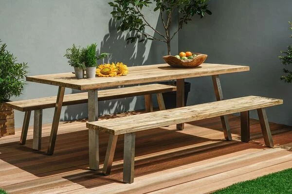 OUTFLEXX® Esstischgarnitur, Edelstahl/recyceltes FSC®-Teakholz, Tisch ca. 220 x 100 x 76 cm, 2 Bänke, A-Gestell