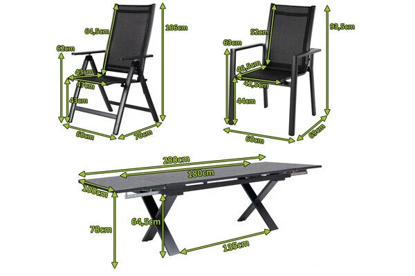 Mit einem Gewicht von ca. 59,25 kg und Gesamtmaßen von ca. 180/280 x 100 x 78 cm ist der schwere Tisch äußerst stabil. Sein gekreuztes Tischgestell aus pulverbeschichtetem Aluminium macht ihn auch sehr standhaft. Die Tischbeine haben längs einen Abstand von ca. 135 cm und die Höhe bis zur Tischunterkante beträgt ca. 64,5 cm. Die anthrazitfarbene, rechteckige Tischplatte aus Sicherheitsglas mit Spraystone Finish ergänzt das Tischgestell perfekt und verleiht dem Tisch seine besondere Optik. Alle Gestelle sind solide gearbeitet und bestehen aus korrosionsbeständigem Aluminium im schicken “anthrazit matt”. Die Sitz- und Rückenflächen der Sessel sind mit Textilene im passenden Schwarzton bespannt. Das Material ist unglaublich hautsympathisch und sorgt für ein herrlich luftiges Sitzgefühl, das Sie auch in der Sommerhitze nicht im Stich lässt. Designstarke Armlehnen schenken den Sesseln erhöhten Komfort. Die Gesamtmaße der Stapelsessel liegen jeweils bei ca. 60 x 69 x 93,5 cm mit einem Gewicht von ca. 3,2 kg. Die Multipositionssessel wiegen jeweils ca. 5 kg bei Maßen von ca. 60 x 70 x 106 cm. Alle Sessel sind dank der hohen Qualität und erstklassigen Verarbeitung bis ca. 130 kg belastbar. Natürlich können Sie die Sitzmöbel auch kinderleicht stapeln oder zusammenklappen und bis zum nächsten Einsatz verstauen.