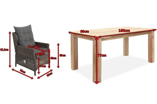 Die gemütlichen Diningsessel sind wahrlich Verwandlungskünstler. Hier können Sie gemütlich mit einem guten Buch in der Sonne liegen oder aber auch ganz bequem Ihr Mittag- oder Abendessen zu sich nehmen. Hierzu brauchen Sie einfach nur Platz zu nehmen und sich Ihren Lieblingssessel problemlos in eine bequeme Liege- oder Sitzposition einstellen. Dies gelingt kinderleicht dank der integrierten Gasdruckfeder – die Rückenlehne kann mit einem kleinen Hebel an der Seite stufenlos verstellt werden. Die Sessel haben ein Gesamtmaß von ca. 78 x 63 x 92,5 cm. Die Sitzfläche ist ca. 64 cm tief, die Sitzhöhe mit Kissen liegt bei ca. 51 cm. Die Armlehnen mit einer Höhe von ca. 65 cm sorgen bei diesem Sessel für besonderen Komfort.