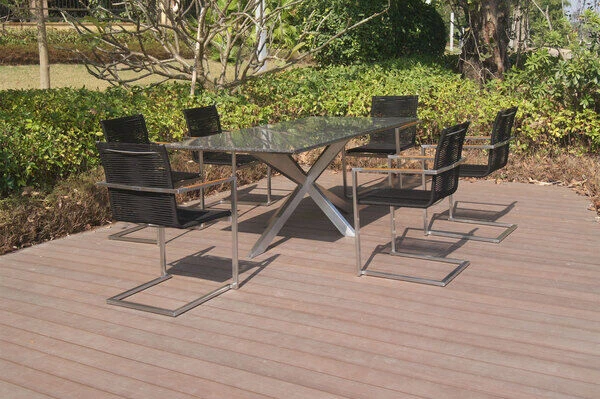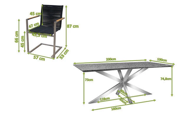 OUTFLEXX Esstischgarnitur, silber/anthrazit, Edelstahl/Granit/Rope, 200×100 cm, 6 Freischwinger, Armlehnen aus FSC-Teak