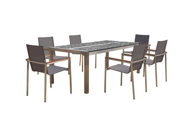 Bei dieser Esstischgruppe treffen hochwertige Materialien und Design auf modernste Weise aufeinander. Das Set besteht aus einem Esstisch mit Granitplatte mit den Maßen von ca. 200×100 cm und 6 Stapelsessel der Marke OUTFLEXX®.