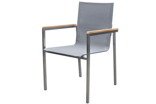 Dieser zeitlose Stuhl besitzt eine Bespannung aus hochwertigem Textilen hergestellt aus 70% Polyvinylchlorid und 30% Polyester. Das witterungsbeständige Material ist durch seine Flexibilität auch ohne Auflagen sehr bequem. Das formstabile Gewebe nimmt kein Wasser auf, ist atmungsaktiv und trocknet nach einem kurzen Schauer sehr schnell. Das sorgfältig verarbeitete Gestell aus rostfreiem 304er Edelstahl ist ebenfalls besonders witterungsbeständig und hält wie d ie anderen Materialien dieses Stuhls sowohl Frost und Hitze als auch Feuchtigkeit und Regen aus. Das für die Armlehnen verwendete Teakholz ist FSC-zertifiziert und stammt damit aus verantwortungsvollen Quellen. So können Sie sich guten Gewissens zurücklehnen und sich so richtig entspannen. Die hochwertigen Materialien und die sorgfältige Verarbeitung sorgen nicht nur für die besondere Optik dieses Stuhls, sondern machen ihn mit einer Belastbarkeit von ca. 150 kg sehr stabil. Dank der schwarzen Kunststoffkappen an den Stuhlbeinen ist Ihr Boden geschützt. Nachdem die Gäste sich auf den Weg gemacht haben, können Sie die Stühle einfach stapeln und damit platzsparend verstauen.