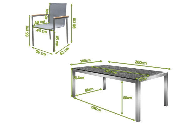 1x OUTFLEXX Esstischgarnitur, silber/anthrazit, Edelstahl/Granit/Textil, 200×100 cm, 6 Stapelsessel, Teakarmlehnen