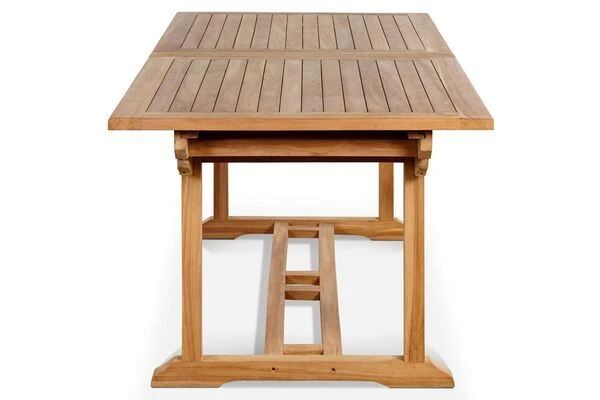 Der Tisch benötigt nicht viel Schnickschnack um selbst den anspruchsvollsten Gartenliebhaber zu überzeugen. Das schlichte Design in Kombination mit dem natürlichen Material, verleiht dem Tisch sein besonderes Aussehen und sorgt dafür, dass er sich zu nahezu jeder Garteneinrichtung harmonisch kombinieren lässt. Die rechteckige Tischform und die ca. 3 cm dicke Teakholz-Tischplatte machen den Tisch so besonders. Mit seiner Größe von ca. 195/295 x 90 x 75 cm bietet er ausreichend Platz für 8-10 Personen. Die Tischplatte können Sie ganz einfach auf eine Länge von ca. 295 cm ausziehen. Dazu schieben Sie die Tischplatte an beiden Seiten nach außen. In der Mitte können Sie nun das Verlängerungsstück ausklappen und die beiden äußeren Seiten wieder anschieben – perfekt wenn sich spontaner Besuch ankündigt.