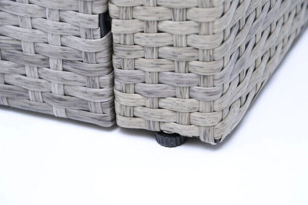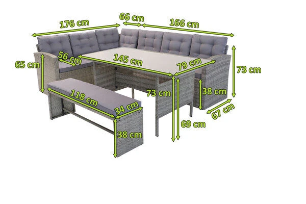 Diese Loungegruppe besteht aus einem Ecksofa, einer Sitzbank und einem Gartentisch. Diese Polyrattangarnitur wurde eigens für den ganzjährigen Aufenthalt im Freien konzipiert. Das flache, hellgrau meliert Geflecht aus Polyrattan bedeckt ein Gestell aus pulverbeschichtetem Aluminium. Aluminium ist ein gern und oft verwendetes Material beim Bau von Gartenmöbeln, da es eine hohe Stabilität und Langlebigkeit aufweist. Zudem ist es ein leichtes Material, besitzt eine gute Korrosionsbeständigkeit und ist witterungsbeständig. Auch wenn das Gestell nicht sichtbar ist, trägt es eine Pulverbeschichtung, da diese dem Aluminium einen dauerhaften Korrosionsschutz und eine anhaltende Korrosionsbeständigkeit verleiht. Polyrattan ist ein künstlich hergestelltes Flechtmaterial auf Kunststoffbasis und glänzt vor allem durch die Eigenschaften Elastizität und UV-Beständigkeit. Dazu ist das Material elastisch, besitzt eine natürliche Optik und braucht nur wenig Pflege – so werden Sie mit wenig Aufwand lange Freude an Ihren neuen Gartenmöbeln haben!