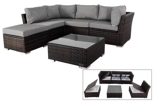 Variable Sitzgruppe mit Kissenboxfunktion aus Polyrattan in braun-marmoriert inkl. Kaffeetisch, Ersatzbezugset in grau und Abdeckhaube