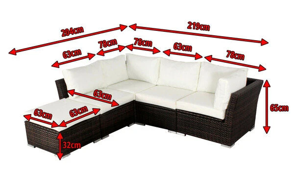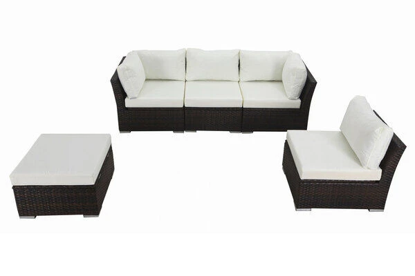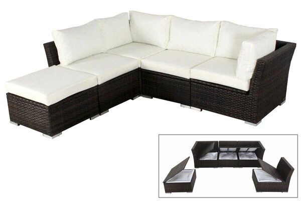 Die gemütliche Loungegruppe besteht aus fünf Einzelteilen, die Sie beliebig anordnen können: ob als bequemes 4-Sitzer Sofa mit Hocker oder als Sitzgruppe mit 5 Sitzmöglichkeiten – Sie bestimmen, wie sich die Möbel auf Ihrer Terrasse am besten präsentieren.