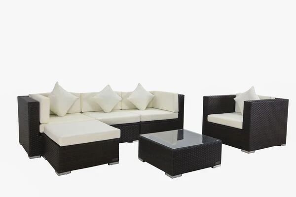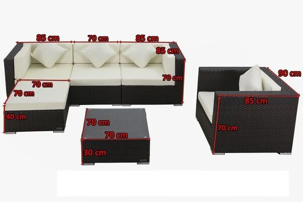 Ein Mittelelement, zwei Eckelemente, ein Sessel sowie ein Hocker und ein Kaffeetisch mit Glasplatte und Sitzpolster bilden zusammen eine gemütliche Loungegruppe für Ihren Garten oder Terrasse. Die bequeme Polsterung und die hochwertig bezogenen Kissen mit einem wasserabweisenden Bezug aus 100% Polyester (300g/m²) sorgt für den nötigen Komfort und wird Ihnen die Sommerzeit versüßen.