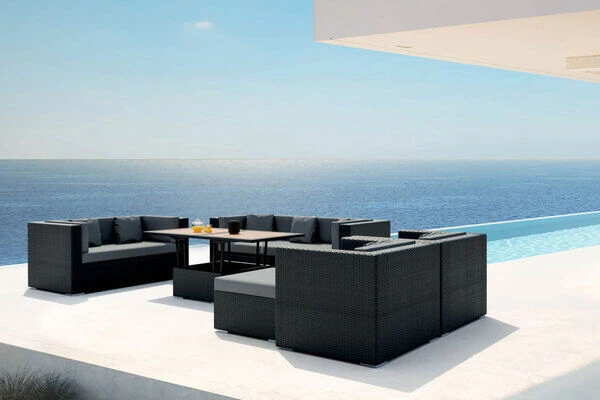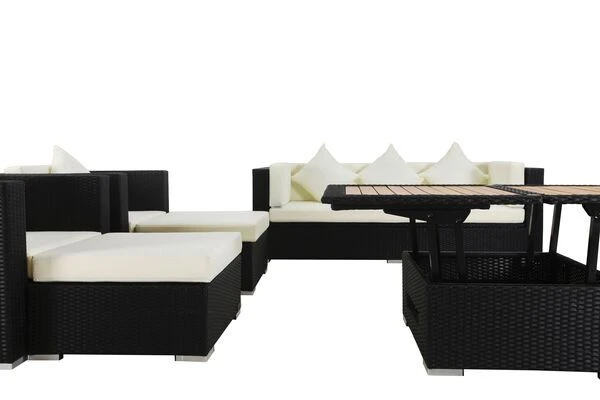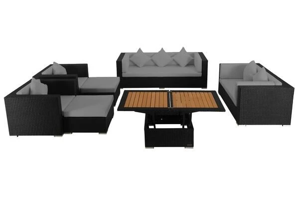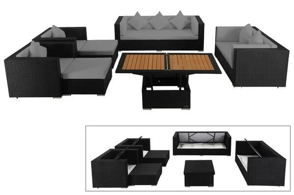 Großes Loungemöbel-Set mit Kissenboxfunktion inkl. höhenverstellbaren Loungetisch für 9 Personen aus schwarzem, flachen Polyrattan