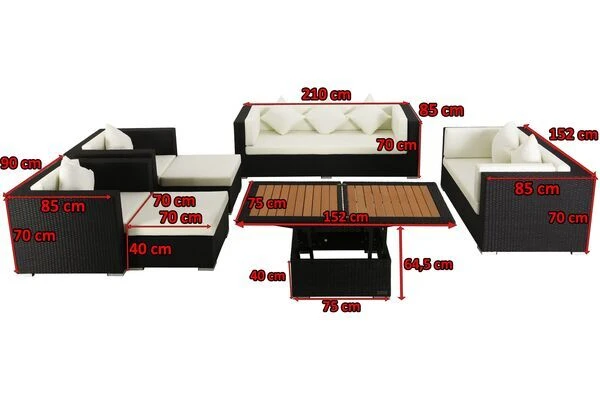Bestehend aus zwei Sesseln, einem 3-Sitzer Sofa, einem 2-Sitzer Sofa, einem höhenverstellbaren Loungetisch und zwei Hocker, lässt sich dieses XXL Gartenmöbel variabel anordnen. Der 1-Sitzer ist mit bis zu ca. 150 kg belastbar, beim 2-Sitzer Sofa sind es ca. 300 kg und beim 3-Sitzer sogar ca. 450 kg. Die Hocker werden jeweils inklusive einer Sicherheitsglasplatte und einem Sitzkissen geliefert. So können Sie ganz einfach aus einem bequemen Hocker einen Kaffeetisch machen, der Gläsern und Geschirr sicheren Stand bietet.