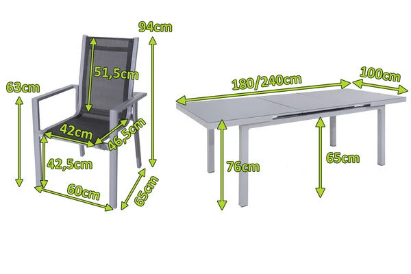 Der innovative Ausziehtisch ist der heimliche Star des Sets. Sie erhalten einen wahren Anpassungskünstler, der Sie auch bei unangekündigtem Besuch nicht im Stich lässt. Den ca. 180 x 100 x 76 cm großen Tisch vergrößern Sie um weitere ca. 60 cm auf eine Gesamtlänge von ca. 240 cm. Wie das geht? Ganz einfach: Ziehen Sie an einem Tischende, so dass beide Tischplattenhälften parallel auseinander fahren und sich die Verlängerungsplatte automatisch direkt auf die richtige Höhe drückt. Nun das zuvor gezogene Tischende wieder Richtung Tischmitte schieben und die Tischplattenhälften verbinden sich mit der Verlängerungsplatte. Jetzt bietet Ihnen der Tisch sogar genügend Platz für 8-10 Personen das spontane Kaffeetrinken ist somit gerettet! Dank seines Gewichts von ca. 47 kg ist der Tisch zudem sehr stabil. Das schicke Design verdankt der Tisch der Kombination aus einer ca. 5 cm dicken Tischplatte aus Aluminium/Einscheibensicherheitsglas und dem robusten Tischgestell, das ebenfalls aus langlebigem Aluminium im edlen silber gefertigt wird. Das ca. 5 mm dicke Sicherheitsglas überzeugt durch seine zahlreichen Vorteile und seinen besonderen, matten Look. Der graue Siebdruck auf der Unterseite der Glasplatte schenkt der Tischplatte ihre graue Optik. Warme Speisen können Sie sogar direkt auf der Platte abstellen. Der Tisch ist das ideale Herzstück, hier wird jedes Zusammenkommen zum Fest.