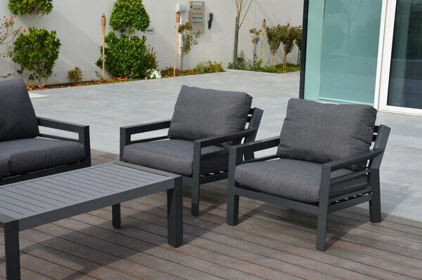 Für Ihre individuelle Gartengestaltung ist der Sessel (ca. 80 x 86 x 72 cm) auch einzeln erhältlich. Sie können ihn vielfältig kombinieren. Die Sitzflächen sind ca. 68 cm tief und kombiniert mit der gemütlichen grauen Sitzpolsterung aus Olefin (100 % Polyester) in einer Stärke von ca. 10 cm erhalten Sie höchsten Sitzgenuss und die Entspannung kommt fast von allein. Das Gestell ist aus stabilem Aluminium in der Farbe anthrazit.