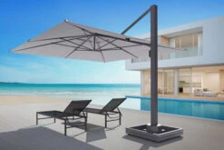 Zum Lieferumfang dieses hochwertigen Sonnenschirmes gehört neben einer Schutzhülle auch ein Plattenständer für Wegeplatten 50x50x5cm (Achtung: Lieferung erfolgt ohne Platten!). Das Gewicht des Schirmständers muss ein Mindestgewicht von 120kg betragen, damit der Schirm mit seinem Nettogewicht von ca. 18kg einen sicheren Halt hat.