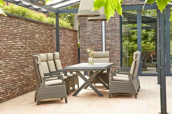 Gönnen Sie sich ein wenig Luxus in Ihrem Alltag und verbringen Sie in gepflegter Atmosphäre den Tag auf Ihrer Terrasse: bei einem leckeren Frühstück, bei einem genüsslichen Brunch oder lassen Sie bei einem Abendessen den Tag in geselliger Runde ausklingen. Dieser bequeme Dining Sessel lädt Sie und Ihre Gäste jederzeit zum Zurücklehnen und Verweilen ein. Stellen Sie die Rückenlehne des Anpassungskünstlers ganz einfach über einen Knopf in der Armlehne stufenlos ein. Die verbesserte Movetechnik sorgt für eine sanft laufende Rückenlehne, die müheloses Entspannen ermöglicht. Der Sessel hat ein Gesamtmaß von ca. 76 x 62 x 109 cm. Die ca. 50 cm breite Sitzfläche bietet genügend Platz. Mit einer großzügigen Sitztiefe von ca. 48 cm und bei einer Sitzhöhe von ca. 44 cm lässt es sich hier auch herrlich bei einem Nickerchen entschleunigen. Die praktischen Armlehnen aus Aluminium in einer Höhe von ca. 64 cm bieten zusätzlichen Komfort und sind echte Hingucker. Passende Sitzpolster in der Trendfarbe taupe meliert verleihen dem Sitzmöbel ein unvergleichliches Sitzerlebnis.