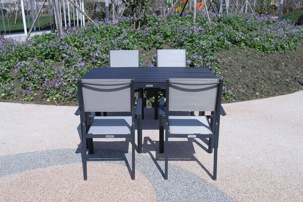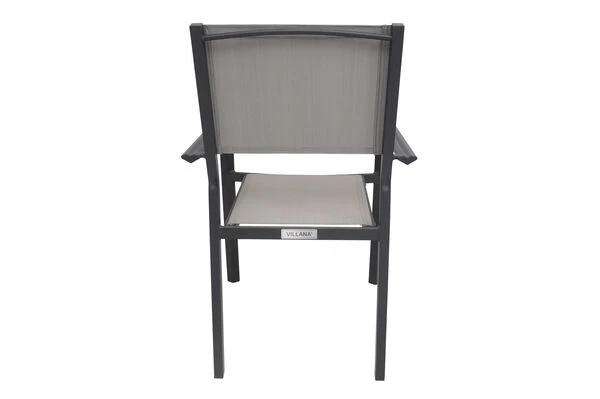 Diese Esstischgarnitur besteht aus 4 bequemen Sesseln und einem Gartentisch – perfekt, für eine kleine Runde aus Freunden, Familie oder Nachbarn. Bei Bedarf können Sie diese Gruppe mit passenden Artikeln der VILLANA Serie erweitern. Der optisch zeitlose Esstisch hat Maße von ca. 150 x 90 x 75 cm und besitzt ein Gestell aus pulverbeschichtetem Aluminium in der Farbe Anthrazit. Aluminium ist ein gern verwendetes Material im Gartenmöbelsektor, da es besonders leicht, zeitgleich jedoch sehr stabil ist. Dazu kommt der geringe Pflegeaufwand durch die Pulverbeschichtung. Die meisten Verschmutzungen lassen sich unkompliziert mit Wasser aufweichen und anschließend abspülen oder mit einem weichen Schwamm entfernen. Das gewisse Etwas erhält der Esstisch durch seine Tischplatte in der Farbe Schwarz. Das Holzimitat schafft Ihnen die Optik von Holz, hat aber den geringen Pflegeaufwand von Kunststoff und ist zudem wetterfest. Die ca. 2 cm dicke Tischplatte bildet ein zuverlässiges Element des Tisches. Die geschickte Kombination von modernen Materialien ermöglicht ein geringes Gewicht von gerade einmal ca. 18,7 kg mit einer maximale Belastbarkeit von ca. 50 kg. Mit der Tischunterkante in Höhe von ca. 68 cm lassen sich die Stühle problemlos unter die Tischplatte schieben.