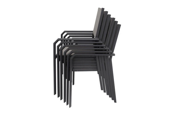 Die im Set enthaltenen Sessel sind nicht nur elegant, sondern auch praktisch! Die Stühle mit Maßen von jeweils ca. 58 x 57 x 90 cm lassen sich bei Nichtgebrauch einfach stapeln und platzsparend verstauen. Auch die Sessel haben ein Gestell aus pulverbeschichtetem Aluminium in der Farbe Anthrazit. Dazu ist das Leichtgewicht mit ca. 2,9 kg besonders stabil und beeindruckt mit einer maximalen Belastbarkeit von ca. 160 kg. Dabei kommt der Komfort nicht zu kurz! Die geteilte Sitz- und Rückenfläche ist mit dem modernen Material Textilene (70% Polyvinylchlorid, 30% Polyester) in der Farbe Grau bespannt. Das Kunststoffgewebe zeichnet sich vor allem durch seine hohe Belastbarkeit und seinen hohen Komfort aus. Zudem ist es frost- und hitzebeständig, was zusammen mit der hohen Lichtbeständigkeit für eine lange Attraktivität Ihrer Sitzmöbel sorgt. Auch nimmt Textilene kaum Feuchtigkeit auf, so dass die Sitzfläche nach einem Regenschauer schnell wieder trocken ist. Mit einer Sitzhöhe von ca. 42 cm und einer Sitztiefe von ca. 46 cm wollen Sie aus diesem Stuhl gar nicht mehr aufstehen! Zusätzliche Fußkappen vermeiden unschöne Kratzer auf Ihrer Terrasse und bieten zugleich Schutz für Ihre Möbel.