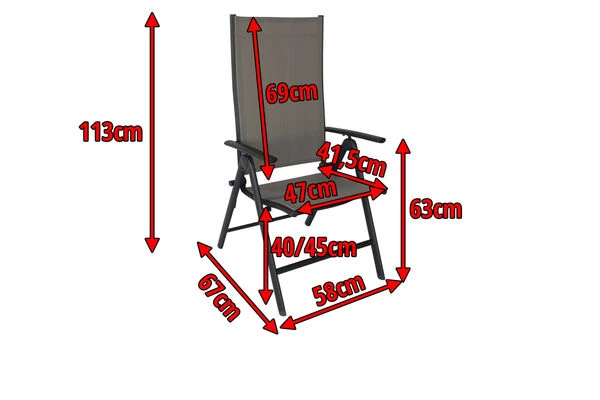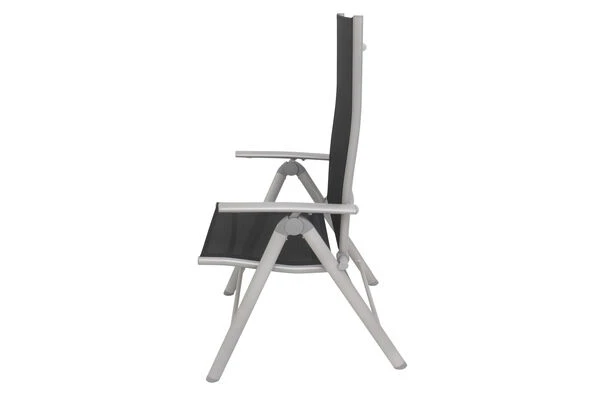 Dieser Villana Hochlehner ist wirklich ein Verwandlungskünstler. Er bietet seinem Nutzer neun verschiedene Einstellungen der Rückenlehne. So ist für jede Situation die richtige Liege- oder Sitzeinstellung dabei – ob beim Essen mit Freunden oder Familie, beim Lesen eines Buches oder beim Sonnenbaden. Der Sessel verfügt über ein hochwertiges, anthrazitfarben pulverbeschichtetes Aluminiumgestell, auf welches ein formstabiles Textil-Gewebe 2×1 (70% Polyvinylchlorid / 30% Polyester) in Grau aufgespannt wurde. Dadurch ist der Sessel sowohl wetterfest als auch pflegeleicht und sichert optimalen Komfort. Mit Maßen von ca. 67 x 58 x 113 cm und einem Gewicht von nur ca. 4,3 kg lässt sich der Stuhl ganz leicht hin und her stellen. Die Fußkappen sind aus schwarzem Kunststoff und schützen den Boden vor unschönen Kratzern beim Verrücken des Stuhles, die silbernen Schrauben aus galvanisiertem Stahl runden die Optik perfekt ab. Die Armlehnen passen sich der jeweiligen Position an und erhöhen den Liege- oder Sitzkomfort. Bei Nichtgebrauch können Sie den Stuhl einfach zusammenklappen und platzsparend verstauen. Mit einer Belastbarkeit von bis zu ca. 160 kg ist der praktische Sessel besonders robust und für erholsame Stunden in der Sonne einsatzbereit. Für Jeden der mehr möchte, als mit seinem Stuhl einfach nur am Tisch zu sitzen.