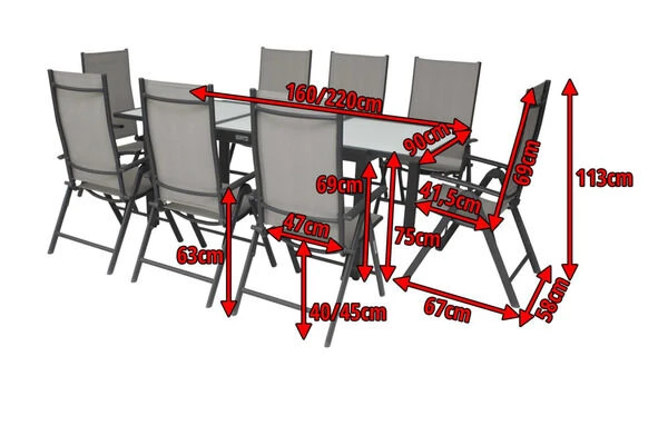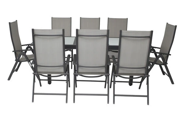 Diese Villana Esstischgruppe bietet Platz für acht Personen – perfekt, um mit Freunden, Familie oder Nachbarn gemütlich im Garten oder auf der Terrasse zu sitzen. Die Gruppe setzt sich aus einem ausziehbaren Gartentisch und acht Multipositionssesseln zusammen, auf Wunsch können Sie diese Gruppe auch noch mit passenden Artikeln der Villana Serie erweitern. Der Tisch ist ca. 90 cm breit und ca. 75 cm hoch, im normalen Zustand hat er eine Länge von ca. 160 cm, so sind Sie sowohl für ein gemütliches Mittagessen mit der Familie als auch für die große Gartenparty bestens ausgerüstet. Das pulverbeschichtete Aluminiumgestell des Tisches kommt in einem attraktiven Anthrazit daher, die ca. 5 mm dicke Tischplatte aus Sicherheitsglas ist weiß. Die Platte zum Erweitern des Tisches ist ebenfalls aus ca. 5 mm dickem Sicherheitsglas gefertigt und lässt sich durch einen Flügelmechanismus ausklappen. Man zieht einfach die beiden oberen Platten auseinander und klappt die darunterliegende Platte nach oben, und schon ist der Tisch auf ca. 220 cm erweitert. Der Sessel verfügt ebenfalls über ein anthrazitfarben pulverbeschichtetes Aluminiumgestell, auf welches ein formstabiles Textil-Gewebe 2×1 (70% Polyvinylchlorid / 30% Polyester) in Grau aufgespannt wurde. Mit Maßen von ca. 67 x 58 x 113 cm und einem Gewicht von nur ca. 4,3 kg lässt sich der Stuhl ganz leicht hin und her stellen. Gleichzeitig bietet er die nötige Stabilität und einen angenehmen Sitzkomfort, denn dieser Sessel ist wirklich ein Verwandlungskünstler. Er bietet seinem Nutzer neun verschiedene Einstellungen der Rückenlehne. So ist für jede Situation die richtige Liege- oder Sitzeinstellung dabei – ob beim Essen mit Freunden oder Familie, beim Lesen eines Buches oder beim Sonnenbaden. Bei Nichtgebrauch lassen sich die Stühle ganz leicht zusammenklappen und nehmen so sehr wenig Platz ein. Mit einer Belastbarkeit von bis zu ca. 160 kg ist der praktische Sessel besonders robust und für erholsame Stunden in der Sonne einsatzbereit. Die Fußkappen der Möbel sind aus schwarzem Kunststoff und schützen den Boden vor unschönen Kratzern beim Verrücken des Stuhles, die silbernen Schrauben aus galvanisiertem Stahl runden die Optik perfekt ab.